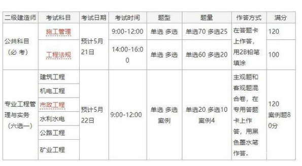 二级建造师考试只考三个科目6个专业方向。具体公共科目两个:《建设工程施工管理》、《建设工程法规及相关知识》;一个专业科目《专业工程管理与实务》。公路工程、水利水电工程、市政公用工程、建筑工程、矿业工程、机电工程6个专业类别,考生报名时可根据实际工作需要选择其中一个专业类别。