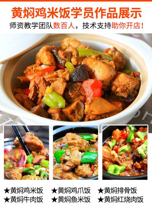 黄焖鸡焖制全过程;原料存放、保鲜技术;原料的进货渠道指导。教学品种有黄焖鸡腿饭、黄焖全鸡、黄焖鸭、黄焖排骨、黄焖红烧肉、黄焖牛腩、黄焖鱼头等;
