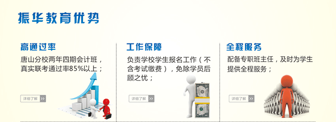振华教育一直本着“尊重教育,服务为本”的理念,坚持“与时俱进,改革创新”的发展方针,现已发展成为一家全国性的办学机构,在唐山、秦皇岛、廊坊、石家庄、重庆、遵义等地区都设有分校;今受到天津滨海新区的大力扶持,特设大港分公司,为大港区人民尽自己的一份绵薄之力。